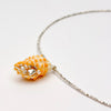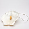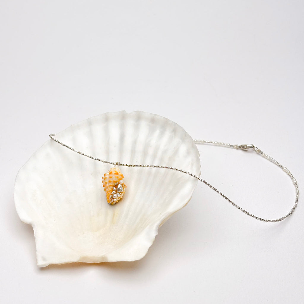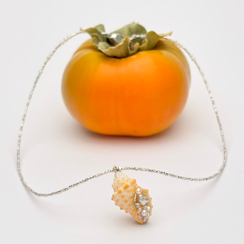 This 16" long necklace is made of 1.3mm faceted fine silver beads from Thailand, 2mm white pearls and a seashell set with tiny Japanese akoya keshi pearls. The clasp is a sterling silver lobster style. ID#KDN2351