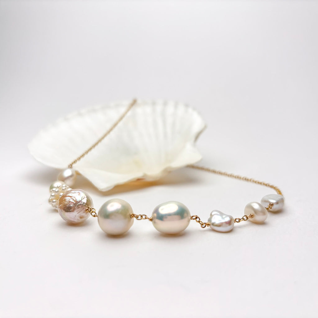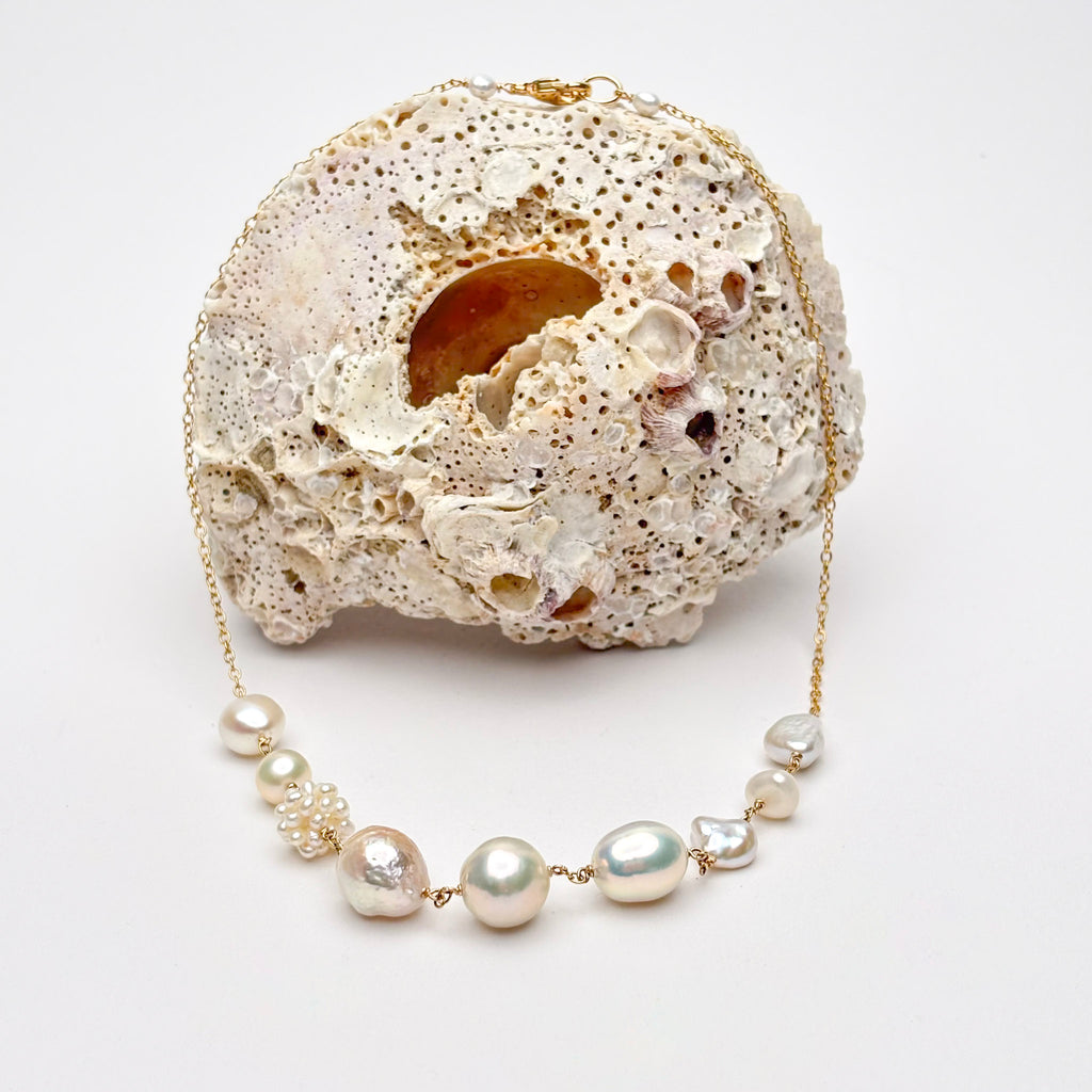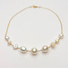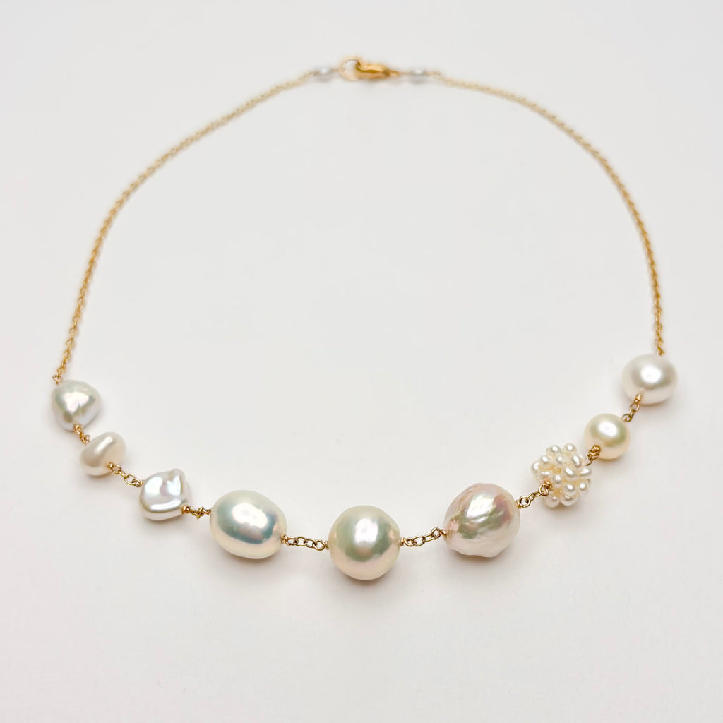 This simple and FUN necklace is made of 9 different white fresh water pearls, rich with luster and texture ... and one woven tiny pearl bead :) This piece is 16" long and made with gold fill chain and a sturdy lobster clasp. ID#KDN2357