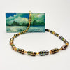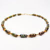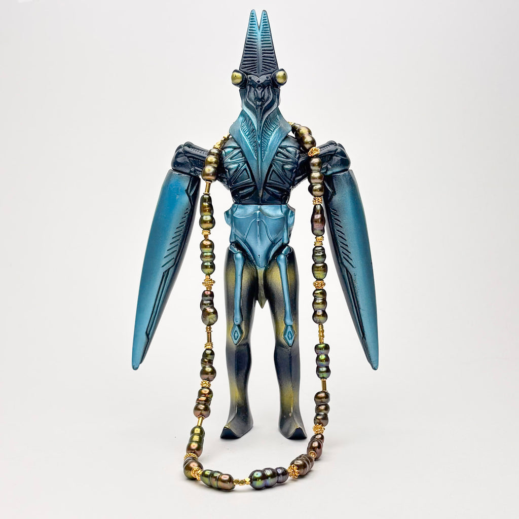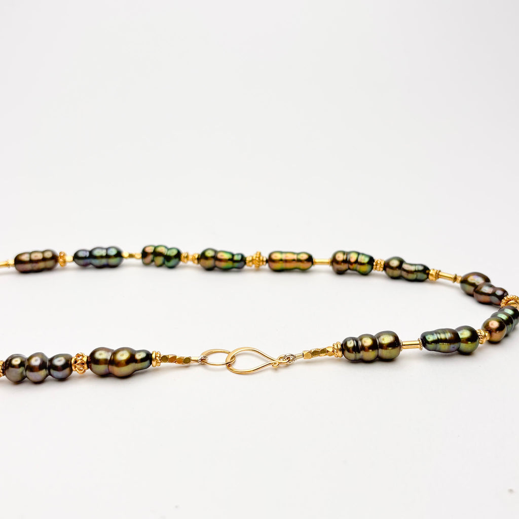 This 18" long necklace is made of dyed peacock green Chinese fresh water pearls (anomalies of pearl cultivation : these pearls grew together in the shell to form these unusual shapes). The pearls were soaked in vats of dye, which is permanent and will not fade, or run. The pearls are approximately 1" long and placed between high quality gold vermeil beads. The clasp is also a high quality vermeil. Light and easy to pair with just about any neutral color. Perfect for the changing of the seasons, and the promise of taking flight. ID#KDN2355