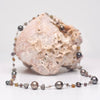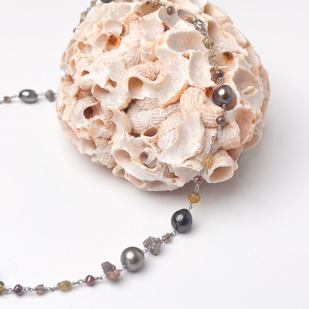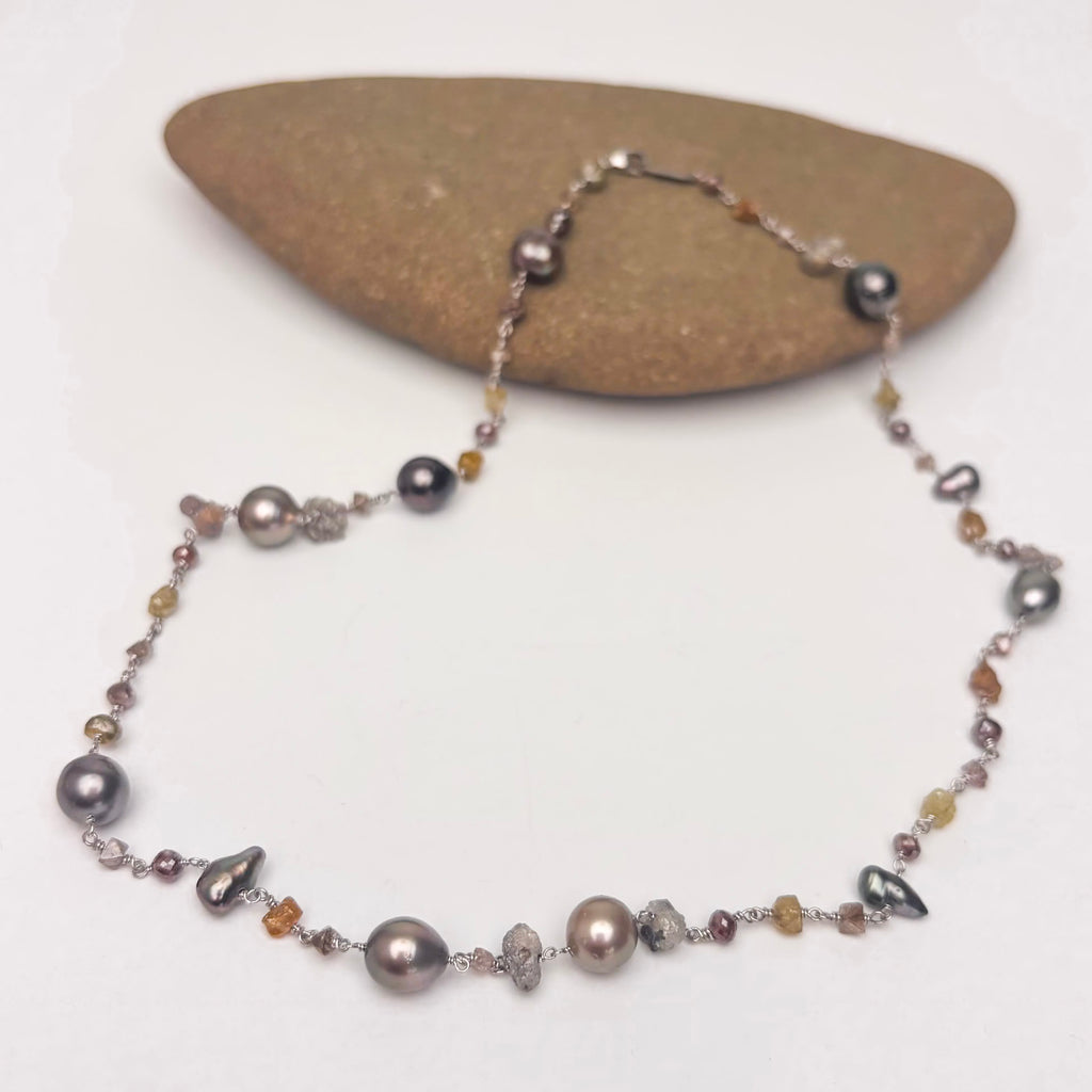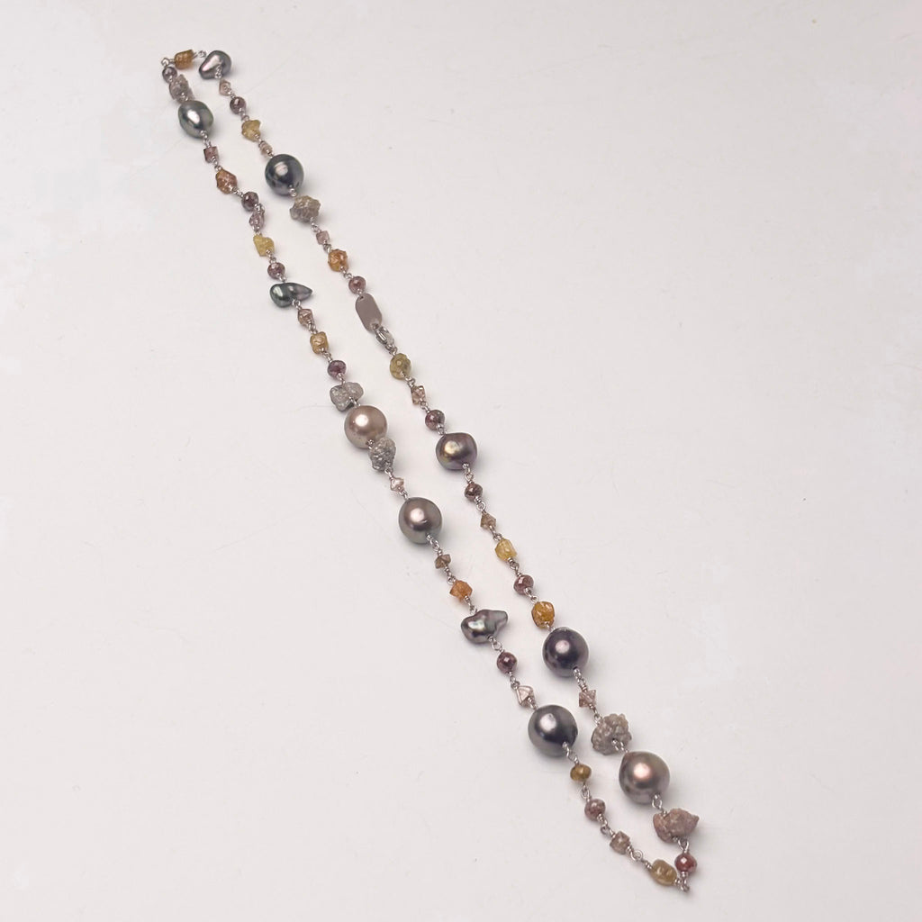 This 17" long necklace is made of a natural color mix of both rough and faceted diamond beads in beautiful earth tones. We have mixed some fun Tahitian keshi pearls and some and a variety of natural color round and baroque tiny tahitian pearls into this necklace. The wire and clasp are solid platinum and this one-of-a-kind piece was all made by hand in our studio. This lightweight piece has an understated sparkle with intriguing shapes and textures.