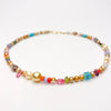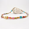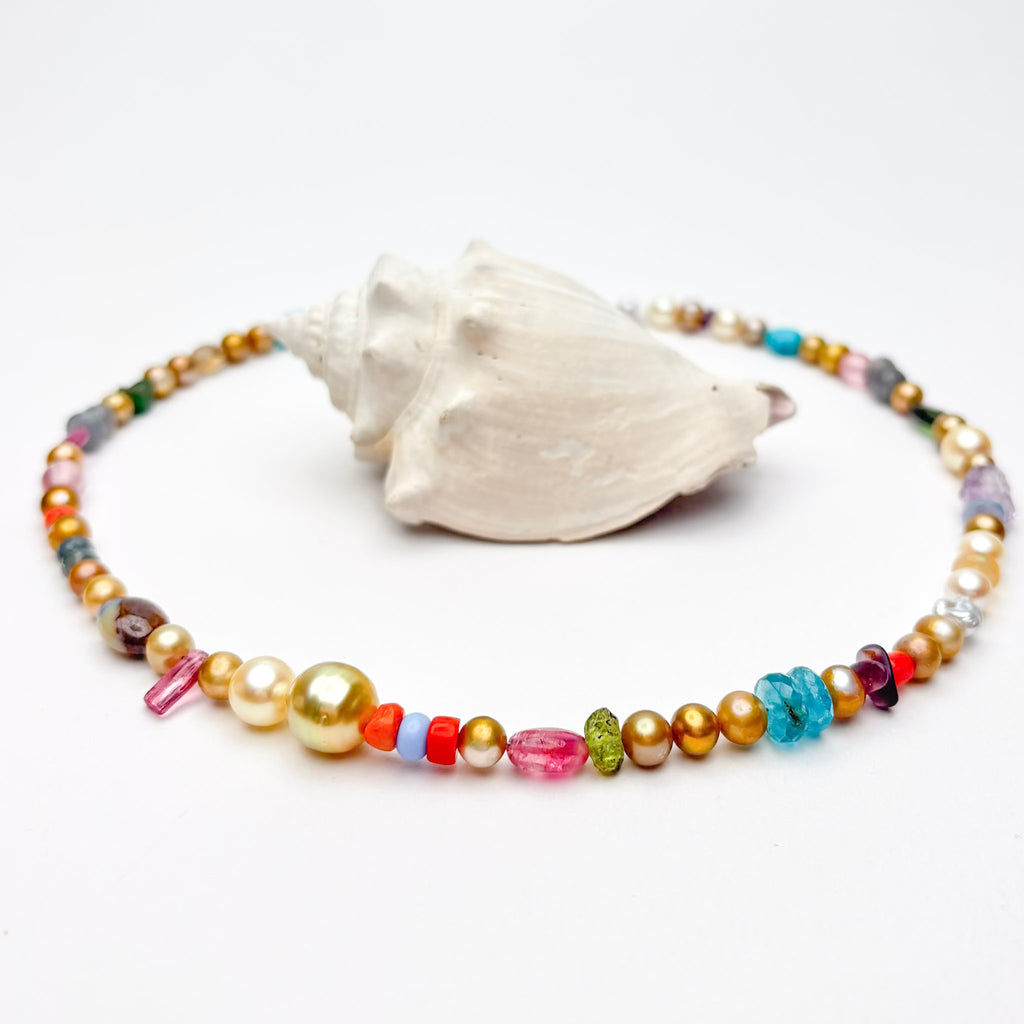 This 17" long necklace is made of natural color Chinese fresh water, South Sea, and Japan Akoya pearls, spinel, turquoise, glass, silver moonstone, tourmaline, amethyst, aquamarine, opal, apatite, peridot, coral,sapphire, and emerald. This FUN mix is finished with a gold vermeil simple hook clasp ID#KDN2347