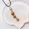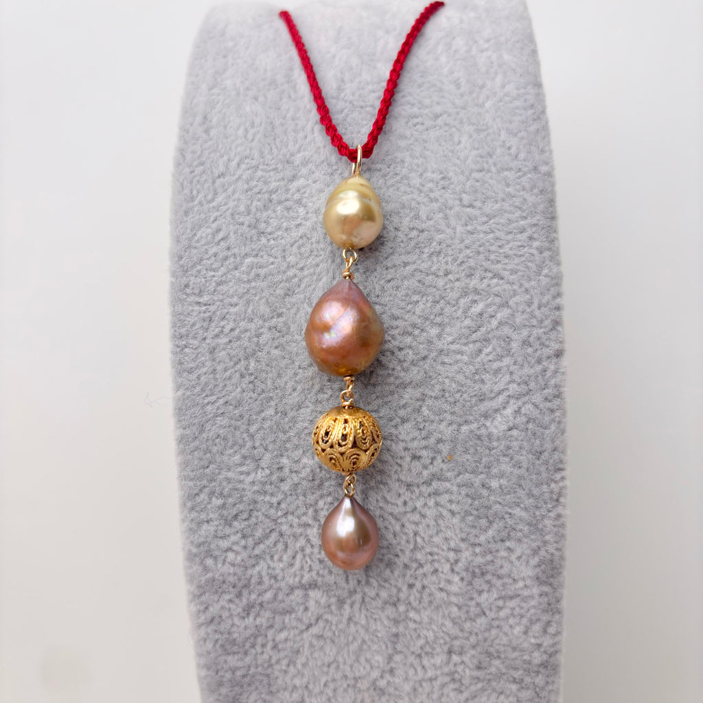 This one-of-a-kind 2.25"" long pendant is part of a series of serious inspiration based in color, texture and of course pearls! This piece is made of one natural golden color South Sea baroque pearl, one natural color brassy golden fresh water drop pearl, one vintage gold vermeil filigree bead, and one dyed sandy mauve fresh water drop pearl. The ring is large enough to accommodate a chain/chord up to 5mm. Play with these.. they are ready to be layered and adored in any season.(this exact pendant is the 3rd from the right in the group photo, some of the others in the group photo have already sold. ID# KDP8899/KDJ1600