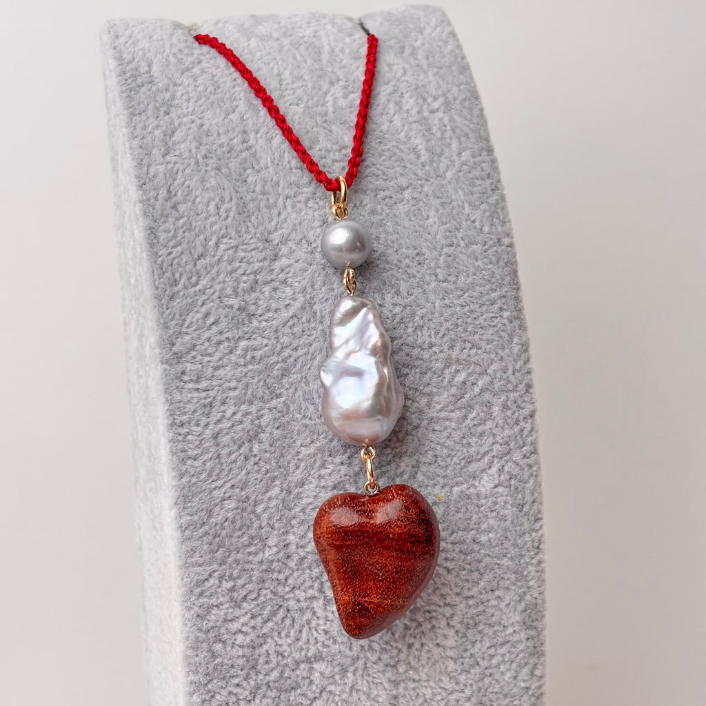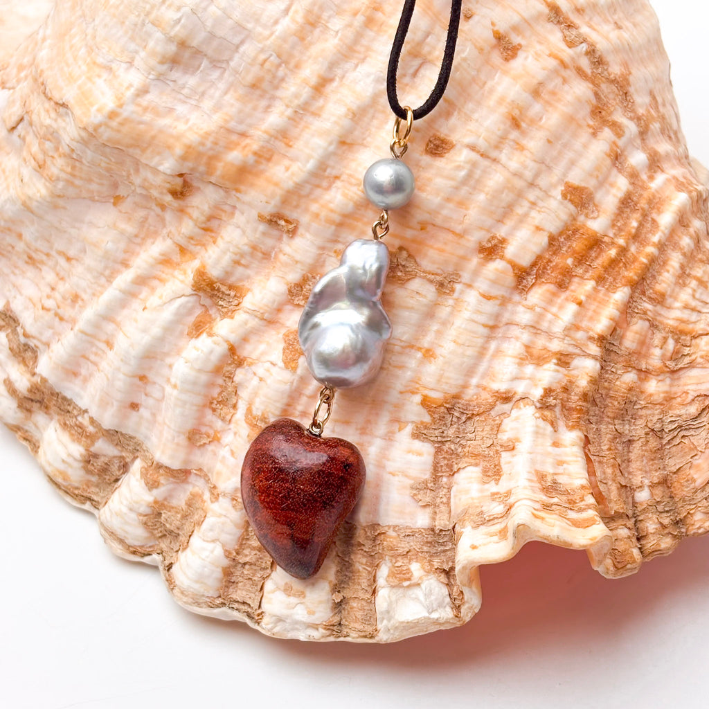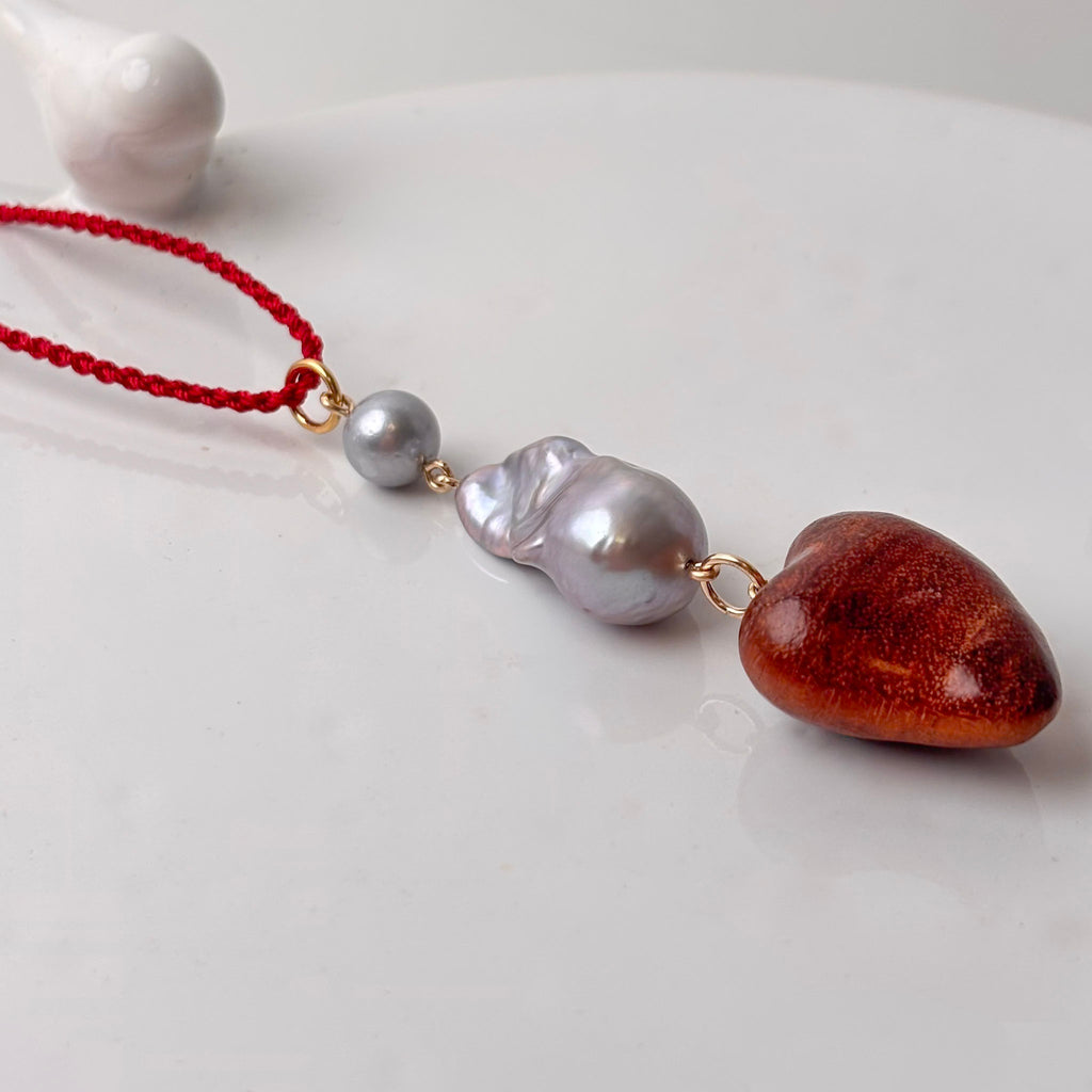 This one-of-a-kind 3" long pendant is part of a series of serious inspiration based in color, texture and of course pearls! This piece is made of a 15x20mm dyed silver color baroque freshwater pearl, a small near round silver fresh water pearl, and a hand carved  wood heart.  The ring is large enough to accommodate a chain/chord up to 5mm. Play with these.. they are ready to be layered and adored in any season.(this exact pendant is the 3rd from the right in the group photo, some of the others in the group photo have already sold. ID# KDP8891/KDJ1600