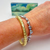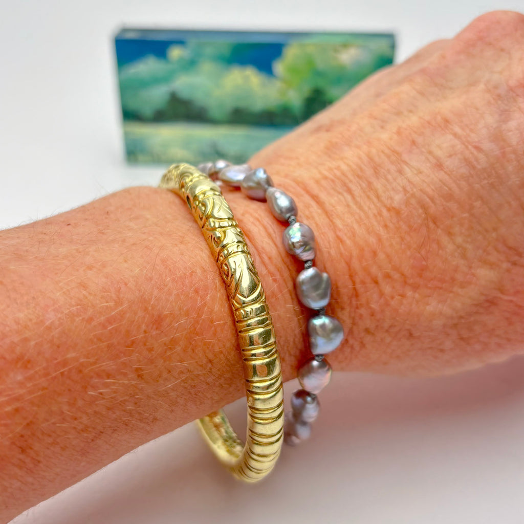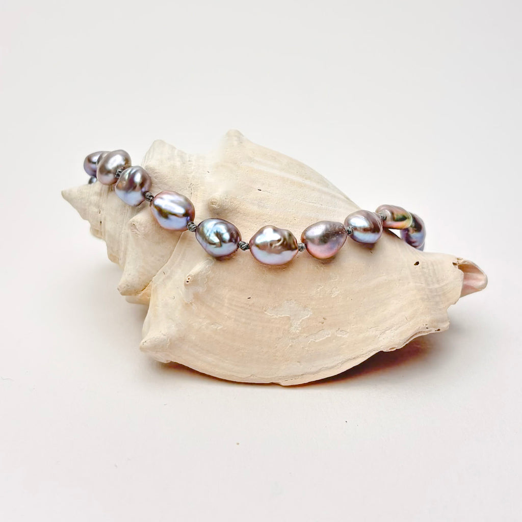 This 7.75" long bracelet is made of lovely natural baroque shape dyed fresh water pearls. (they will NOT change color). The pearls are individually knotted on grey thread and finished with a sterling silver heart design clasp. These pearls play well with just about any stack of your favorite pieces. ID#KDB01125A