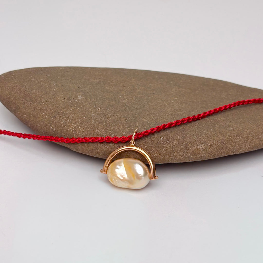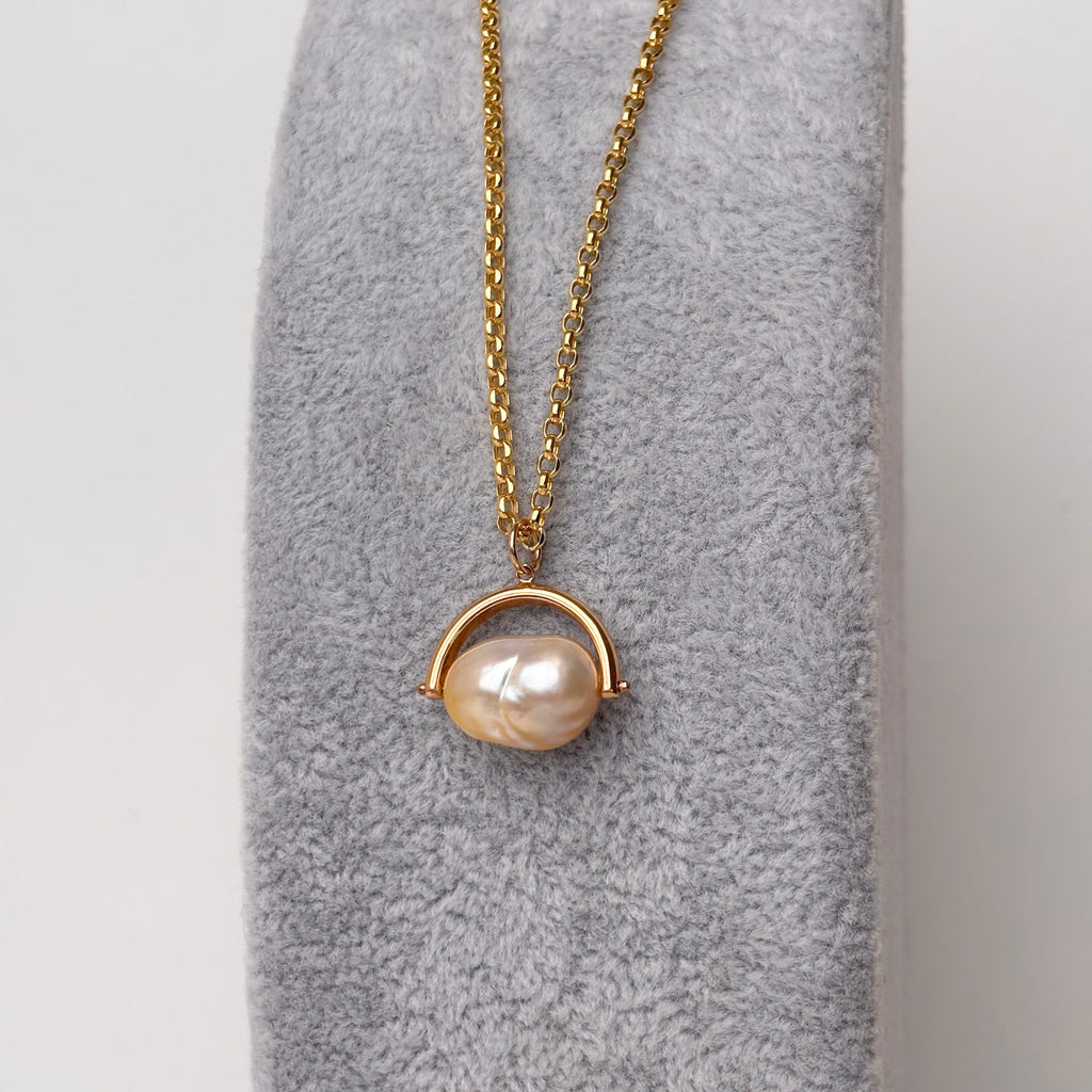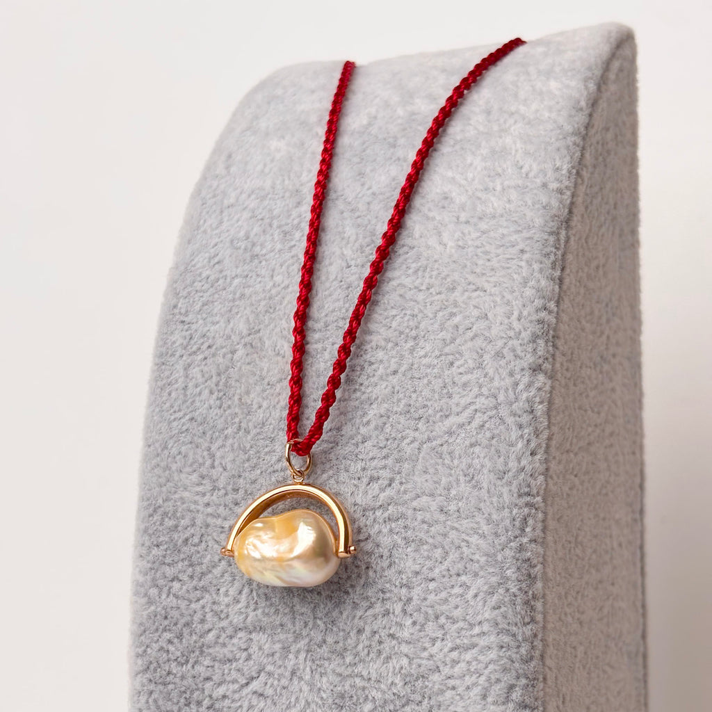 This one-of-a-kind, hand made piece is a great staple that goes with EVERYTHING! The natural color golden South Sea keshi pearl is 10x15mm and is hand set into a solid 14K yellow gold elegant pendant. The loop of the pendant can accommodate a chain/cord up to 4.5mm. ID#KDP8918/KDJ3200
