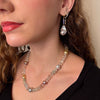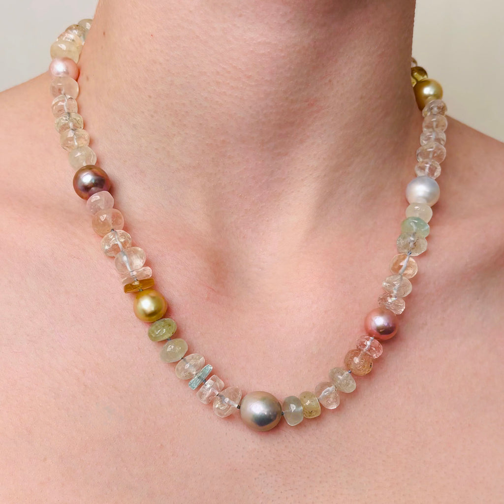 This 19" long natural color aquamarine necklace holds 7 special pearls (including South Sea, Japan Kasumi and Chinese fresh water). The pearls range in size from 10-12.5mm and the beads are approximately 9-11mm. Each bead is hand formed and they are gentle pools of light and texture.. a really special strand! The clasp is rhodium plated silver "sister" style. This piece is hand knotted on sky color thread. ID#KDN2356