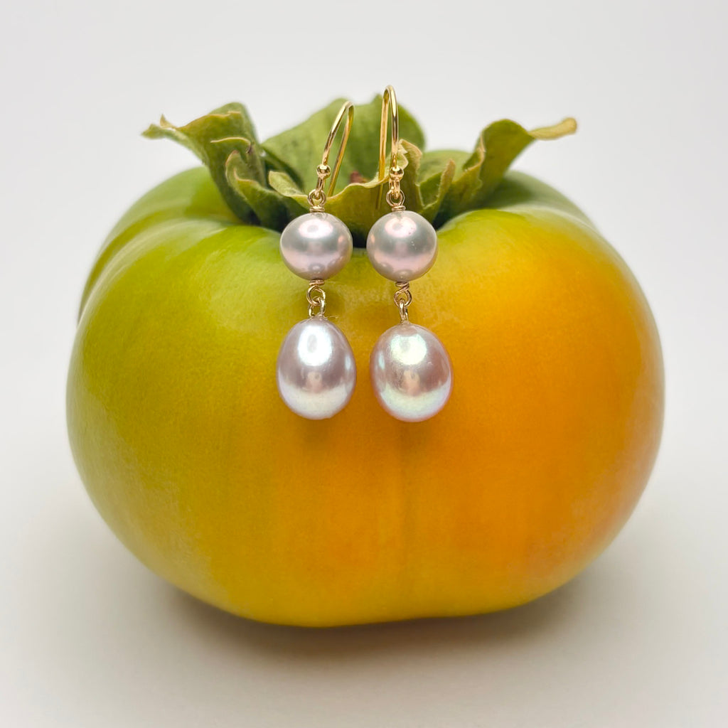 These 1.75" long sweet earrings will play well with just about any other accessories. Made of natural color soft silvery grey Chinese freshwater pearls (8mm). The ear wires are gold fill and as a pair they weigh 3.92 grams. ID#KDE4181