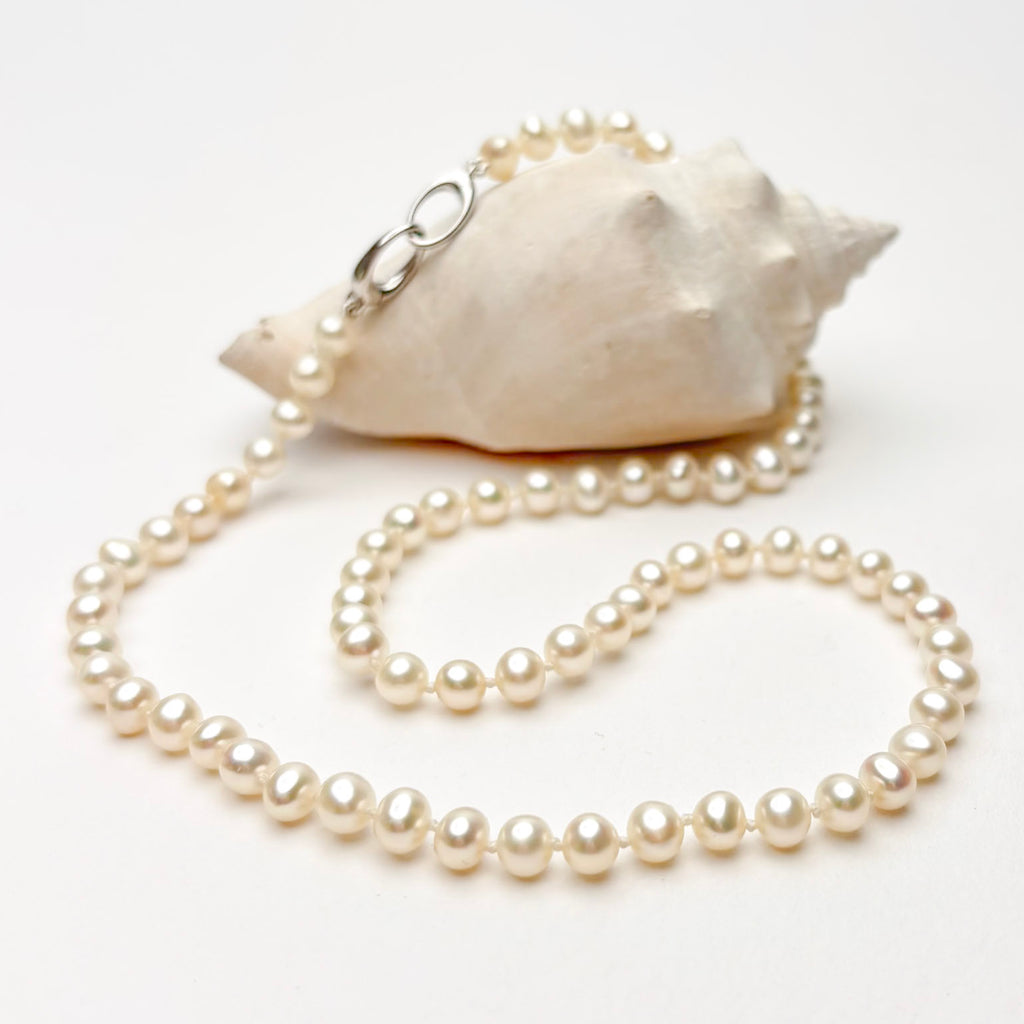 Now out of production for decades, Lake Biwa, Japan was the first and most famous fresh water pearl production. Located in the Shiga Prefecture, Lake Biwa produced mostly pearls with no hard shell bead nucleus. These were widely distributed, mostly to the Arab world. Half a century ago, Pacific Pearls, (our family business) collected many many pearls from Lake Biwa, some loose, some in pairs and many in strands. We are now offering a choice selection of them for sale. The pearls in this necklace are COMPLETELY NATURAL COLOR.. and have AMAZING luster despite their ripe age. The matching on these strands is masterful. The necklace is 17" and the oval shape pearls are 5-5.5mm. The necklace is finished with a rhodium plated silver "orbit" clasp. These are collectors pieces, from the vault of Pacific Pearls. For more information on fresh water pearl farming in Japan, please check out our YouTube channel. ID#KDN2346