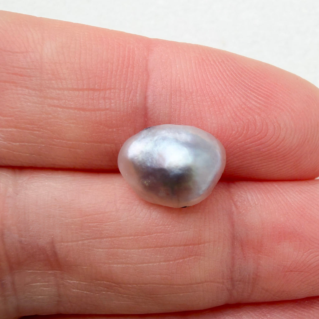 This wild found natural oyster pearl from the Sea of Cortez Mexico, was part of a vast collection from a well respected collector of natural pearls. The pearl measures 8.2 x 10.8mm and is approximately 5mm thick. The "face" of the pearl is mottled with lovely cream and silvery blue hues. The pearl weighs 3 cts. ID#OYPST24