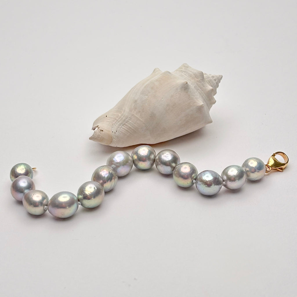 These silvery blue freshwater pearls have FANTASTIC colorplay and the luster is metallic! The pearls are 11-12.5mm. The pearls are near round and semi baroque in shape and the surfaces are varied between smooth and slightly rippled. The clasp is a gold fill lobster.  If you would like a different length or a different clasp, please email us at the time of purchase.  ID#KDB92425E