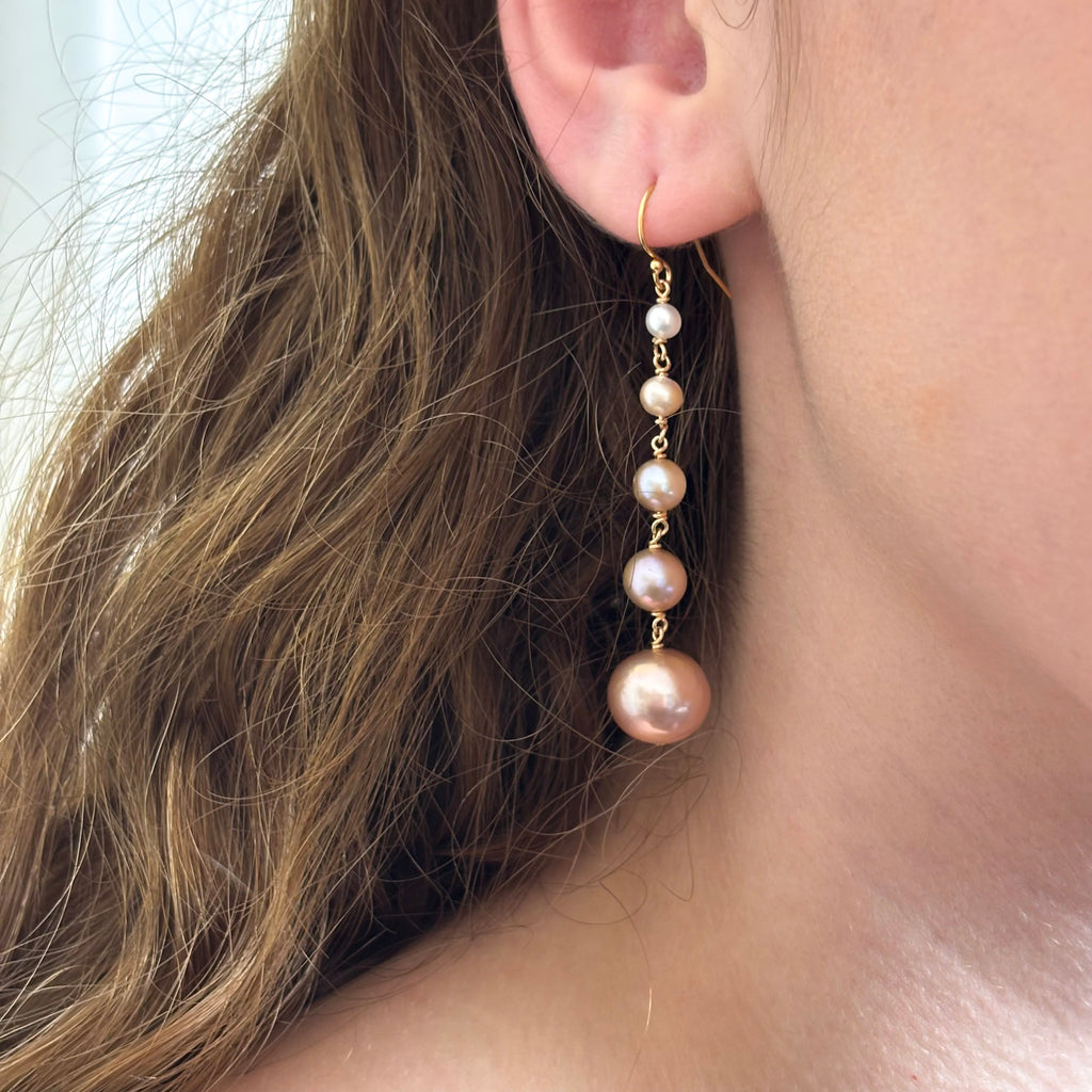 These 2" long ombre wrapped earrings are made of 5 different size and natural color fresh water pearls. The pearls gradate from metallic luster pink at the bottom through soft gold and into white at the tops, they are hand wrapped on gold fill wire. If you would prefer these on solid gold or sterling silver, please email us at the time of purchase. As a pair these sweet earrings weigh 6.8 grams. ID#KDE4173/KDJ3200