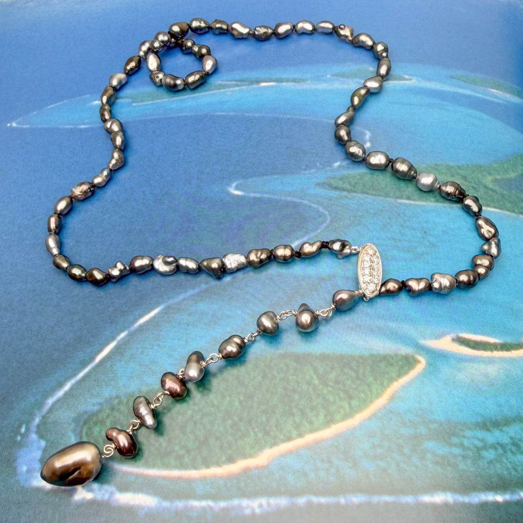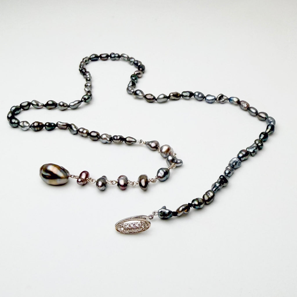 This one-of-kind necklace is made of natural color Tahitian keshi pearls. The piece can be worn as a necklace OR a bracelet! The 14K white gold and diamond clip on EASILY to any part of the hand wrapped portion of this piece. (tired of fiddly clasps.. this one is for you!). The keshi pearls on the strung portion of the necklace range in size from 4-5mm and the gorgeous drop pearl at the bottom is 8x14mm! At it's shortest necklace length the length is 17". At it's longest necklace clip point, it is 20". ID#KDN2474/KDJ9696
