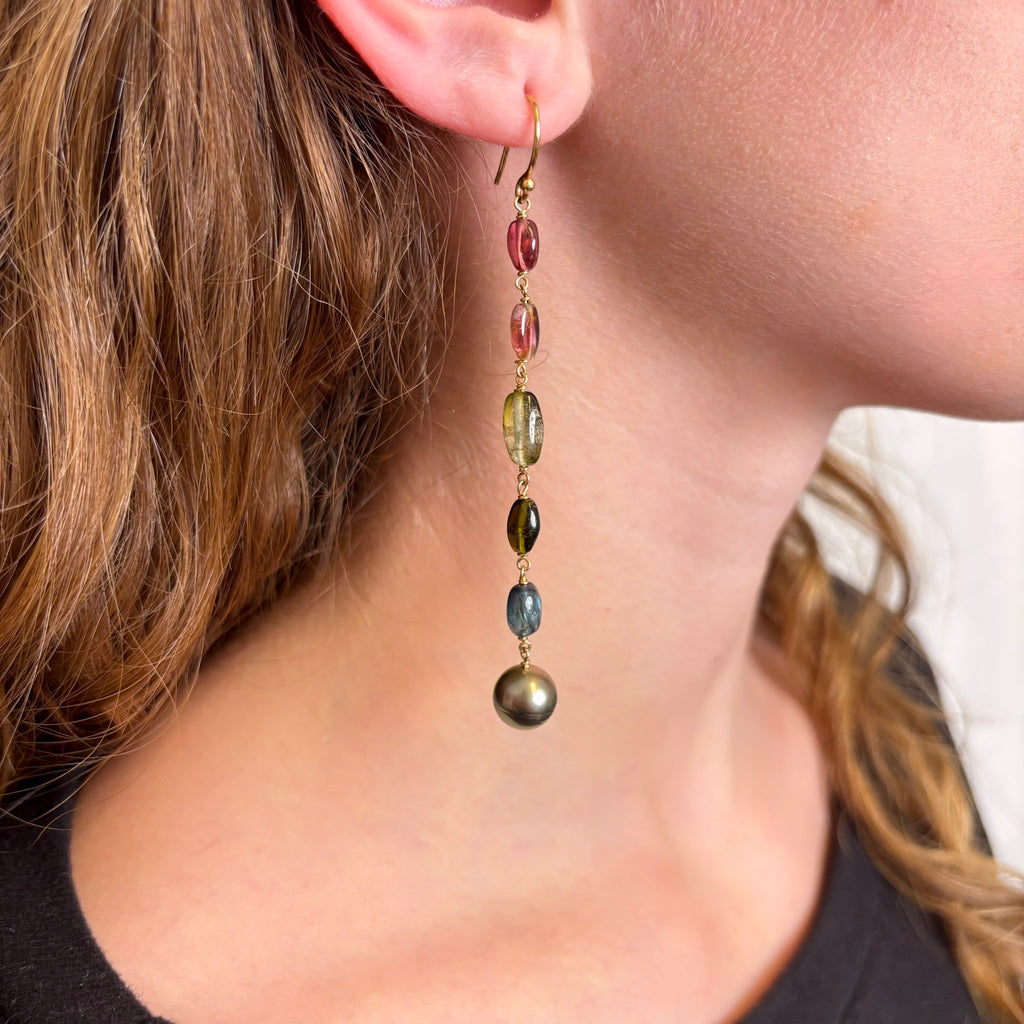 These long earrings are made of natural color vintage tourmaline beads and 10mm Tahitian pearls. The earrings are 3.5" long and as a pair they weigh 8 grams. ID#KDE1278/KDJ400