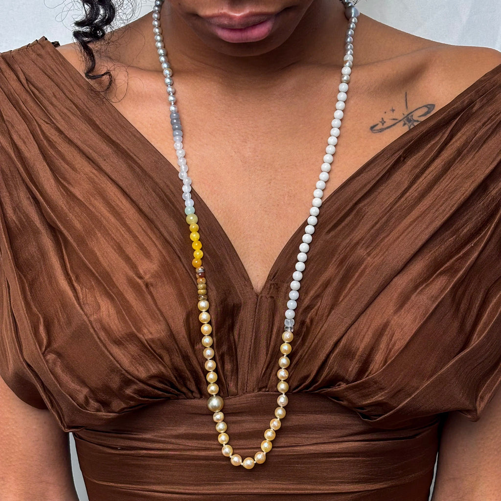 This 32" long endless rope necklace is made of several different colors of jade, with both silver and golden Akoya pearls. There is also one golden South Sea and a silver color Chinese fresh water drop shape pearl. There are some silver moonstone beads, a faceted quartz bead and other ombre surprises in this piece.. it's in my top five favorites of the Season. The pearls and beads range in size from 5-10mm and are arranged to create a soft and brightening palette. ID#KDN2352