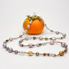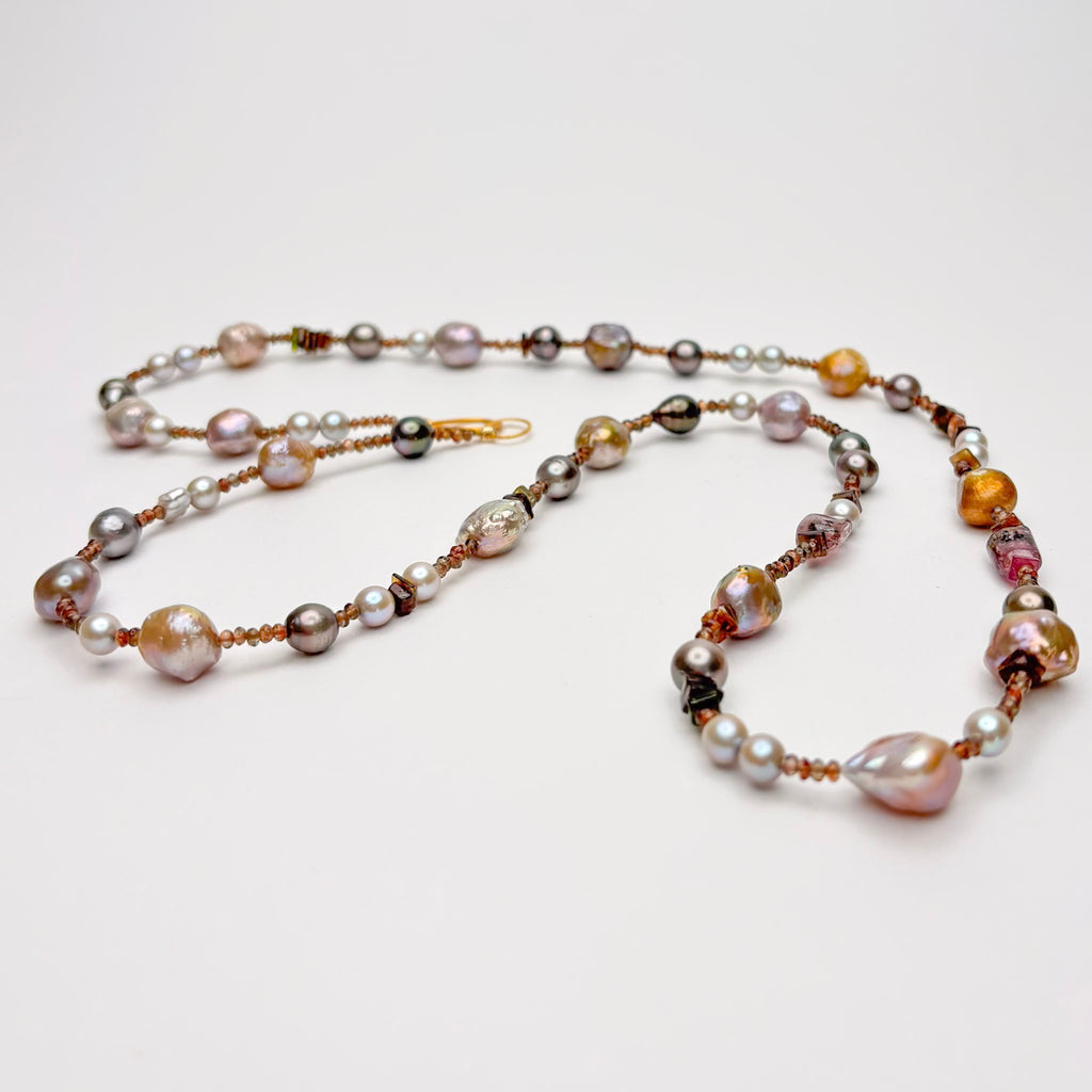 This 30" long necklace is made of natural color Chinese fresh water rose bud pearls, tiny Tahitian pearls and vintage silver Japanese Akoya pearls. The autumn hued stone beads include andalusite and tourmaline. The clasp is a high quality gold vermeil simple hook. This piece is the perfect compliment to a warm cozy sweater, or a or any neutral color top. ID#KDN2350