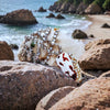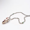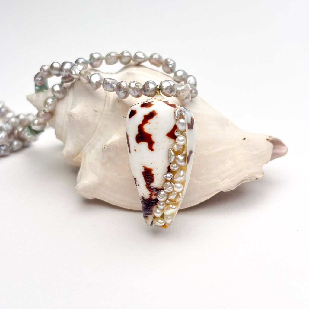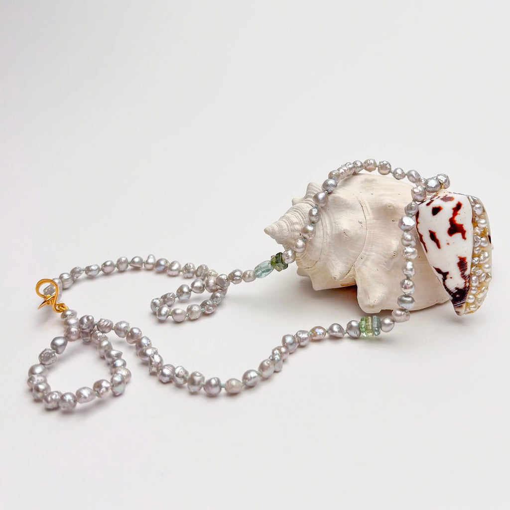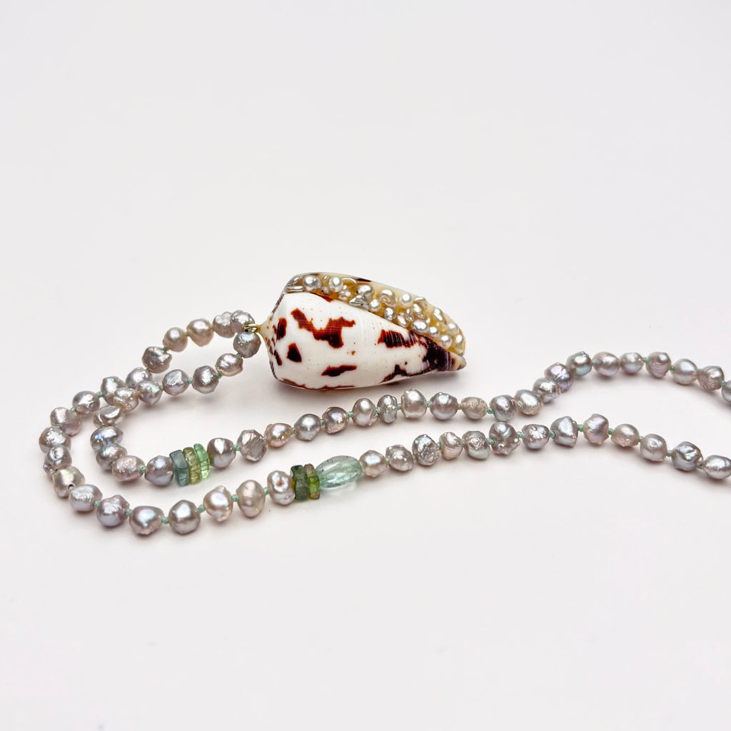 This 20" long necklace is made of silver Chinese fresh water tiny rosebud pearls, hand knotted on silver blue thread. There are a small variety of natural color tourmaline gemstone beads sprinkled in. At the center is a seashell carefully set with tiny Japan Akoya keshi pearls. The necklace is finished with a high quality gold vermeil hook clasp. ID#KDN2335