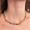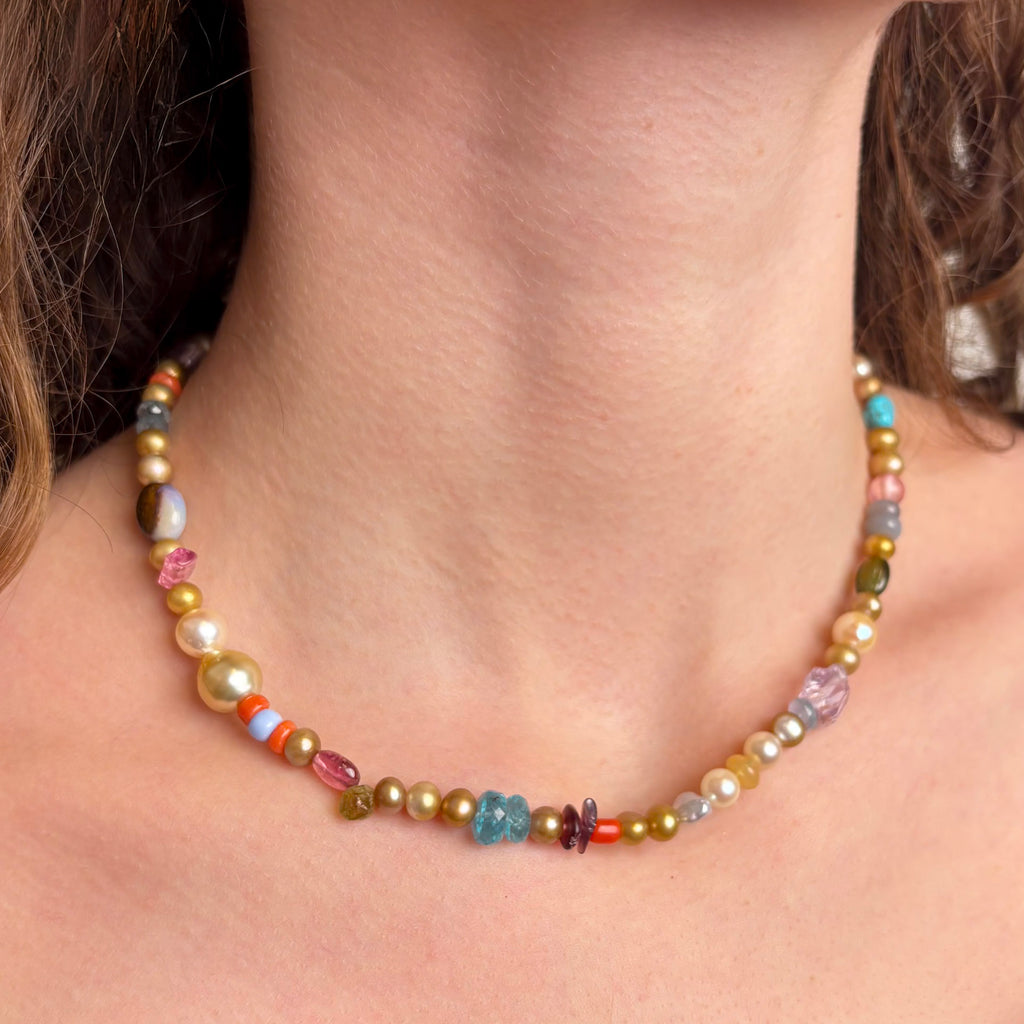 This 17" long necklace is made of natural color Chinese fresh water, South Sea, and Japan Akoya pearls, spinel, turquoise, glass, silver moonstone, tourmaline, amethyst, aquamarine, opal, apatite, peridot, coral,sapphire, and emerald. This FUN mix is finished with a gold vermeil simple hook clasp ID#KDN2347