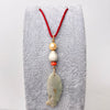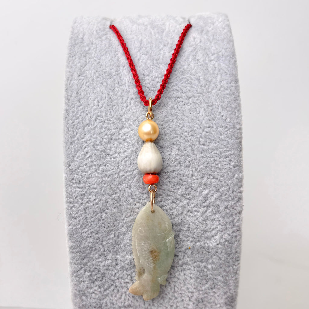 This one-of-a-kind 2.75"" long pendant is part of a series of serious inspiration based in color, texture and of course pearls! This piece is made of one 7.5 vintage natural color Japan Akoya pearl, one job's tear seed from Hawaii, one vintage natural color coral bead and a hand carved jade fish. The fish is 1.5" long and carved on both sides. The ring is large enough to accommodate a chain/chord up to 5mm. Play with these.. they are ready to be layered and adored in any season.(this exact pendant is the 3rd from the right in the group photo, some of the others in the group photo have already sold. ID# KDP8897/KDJ1600