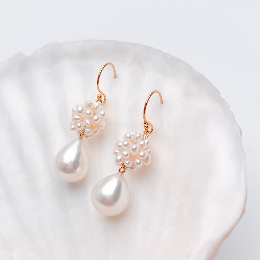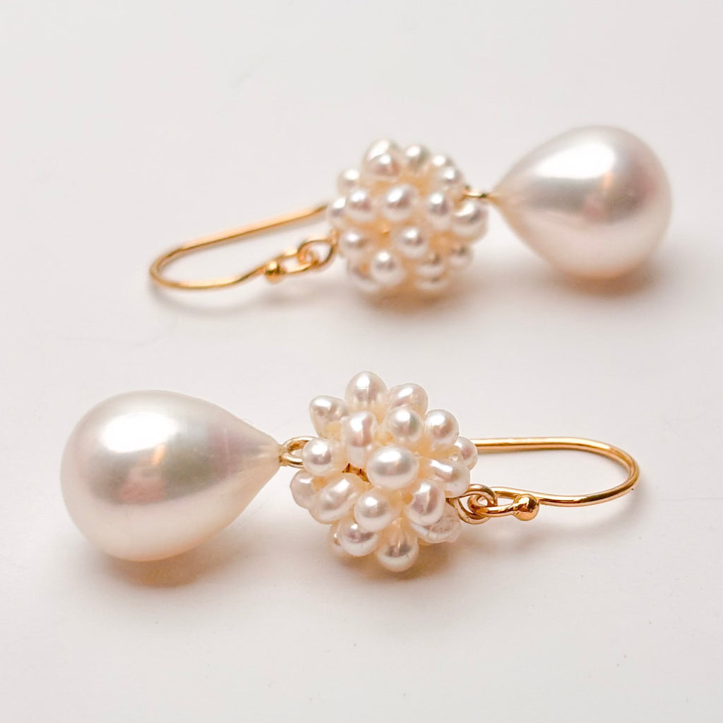 These earrings are made of 9mm white drop pearls and hand woven beads made of tiny pearls 🤯! They are light weight (4.8 grams for the pair!) and about 1.5" long. The findings are gold fill, if you would prefer them in solid gold, please reach out to us at the time of purchase. ID#KDE4195/KDJ1200